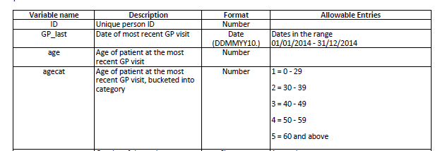 Data dictionaries need to be included for any dataset used in the analysis/research. The data dictionary includes both the original and created variables. The data dictionary should include the following information about each field :