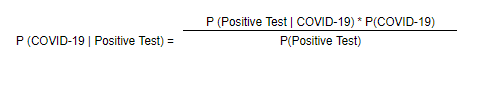 To illustrate this using the COVID-19 example, I can write the Baye’s Theorem formula as :